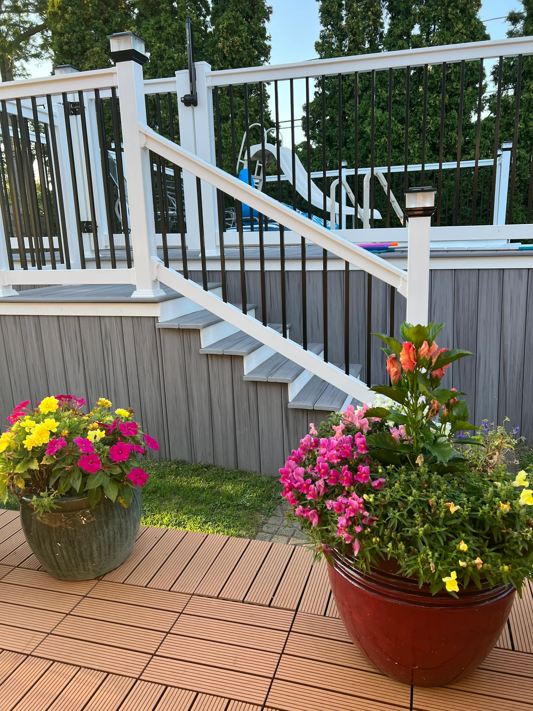 Our team designed and installed a brand-new vinyl deck tailored specifically to the above-ground pool. We paired premium vinyl decking with a combination of vinyl and metal railings to provide a secure, polished look that complements the pool area while ensuring code compliance and safety.